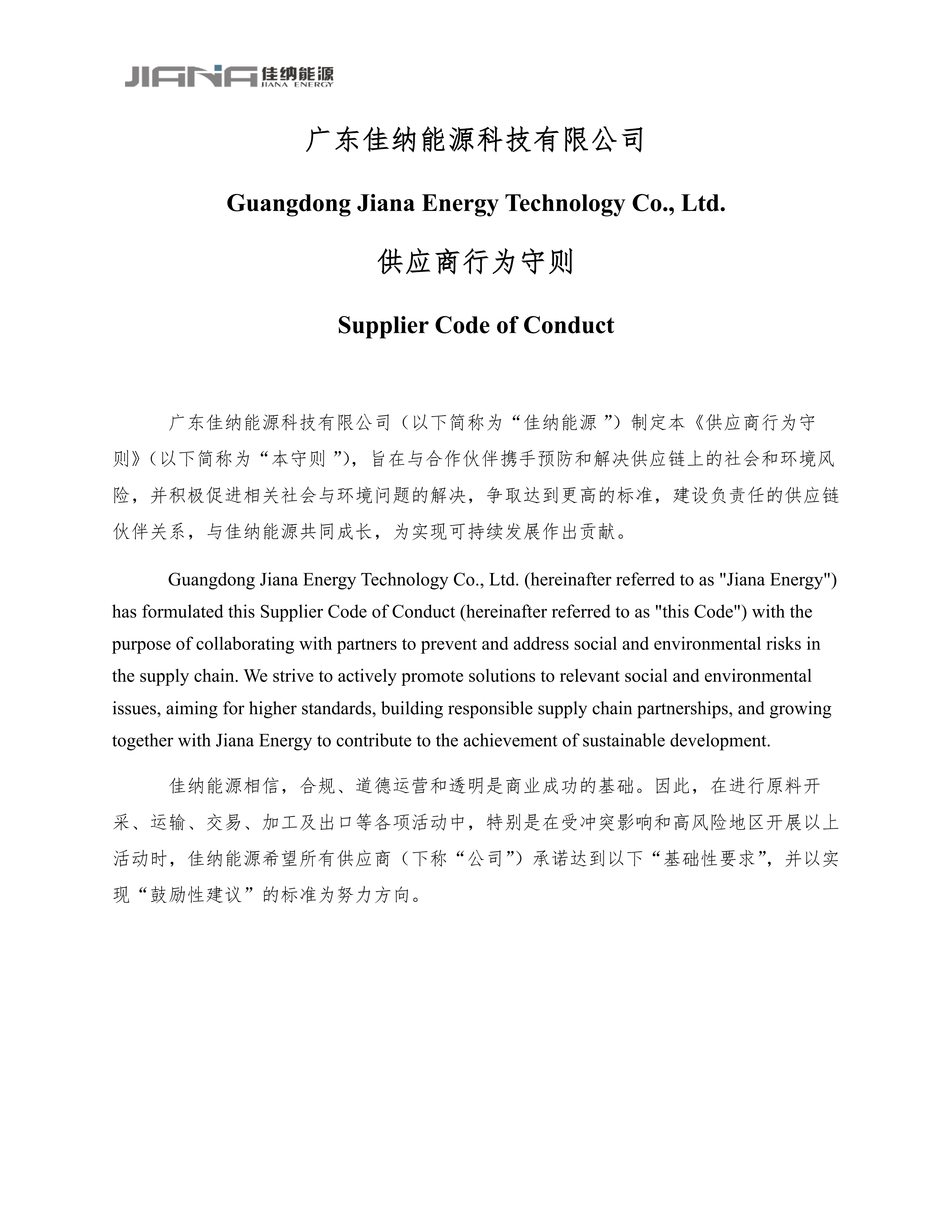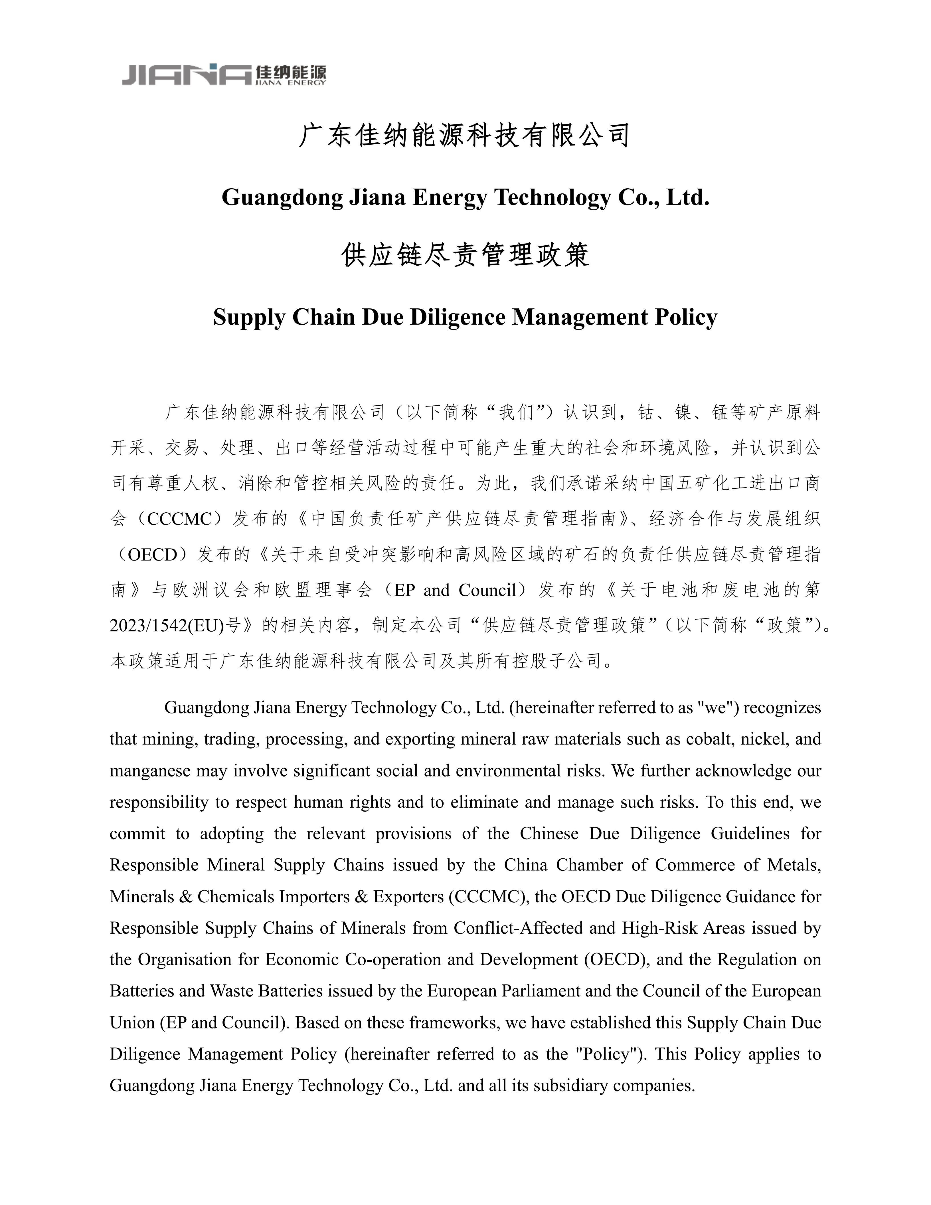 Due Diligence Policy for Responsible Supply Chain广东佳纳供应链尽责管理政策
